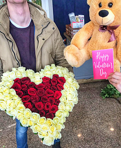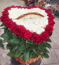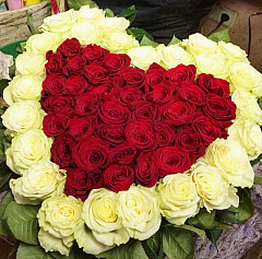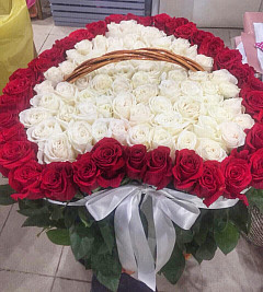 Хотите доставить непередаваемый восторг возлюбленной? Одноименный букет станет лучшим помощников в выполнении этой задачи. Он выложен в форме сердца, где в средние находятся красные розы, без слов указывающие на страстную любовь и желание. Внешне они обрамлены белыми розами, передающими нежность, чистоту намерений и свет. Кайма из зелени придает букету натуральность и природный вид. Такая внушительная цветочная композиция навсегда останется в памяти любимой.